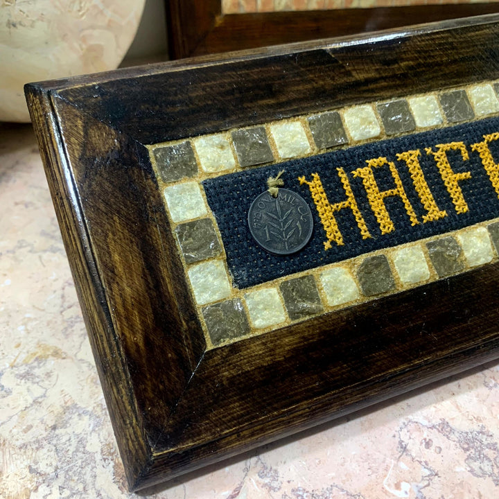 🧵 The word "Haifa" comes to life in golden tatreez stitches, meticulously embroidered on a deep black fabric, reflecting rich heritage and vibrant artistic spirit.